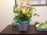 立ち寄った花屋で、ひと際存在感を放っていたのが《ラナンキュラス》のラックスという品種。この時期の花というと、スィートピーやストック、トルコキキョウにアリストロメリア、それにガーベラ、もちろん バラやカーネーションもあり、彩り豊かに賑わっているが、《ラナンキュラス》も旬の人気の花(写真下の黄色い大きな花がそれ、ブーケとかでよく使われる八重の花)、それとはだいぶ花びらの様子も違うが、写真の上のピカピカいやテカテカのツヤのある、そして形はヤマボウシのような花弁の花が、このラナンキュラスの一品種だ。まるで紙粘土に着色して、ニスで仕上げたかのような光沢感、または小さい子のパンパンに張った紅いほっぺのような上品な〈てかり〉にとりこになった。ちなみに、緑色のひょろひょろしたのが、 《ブプレリウム》で、白い小花は《オキシペタラム》、もうこれ以上カタカナはダメだ‥‥。(笑)